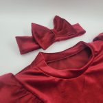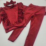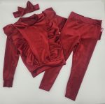 Compleu pentru fetite conceput din material de catifea. Compleul contine bluza, pantaloni si bentita. Detaliu cu volan pe partea din fata a bluzei.