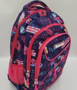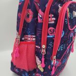 Ghiozdanul este prevazut cu 4 compartimente( 2 mari, unul mijlociu si unul mic), deschidere cu fermoar; 2 buzunare laterale (pentru sticla de apa)