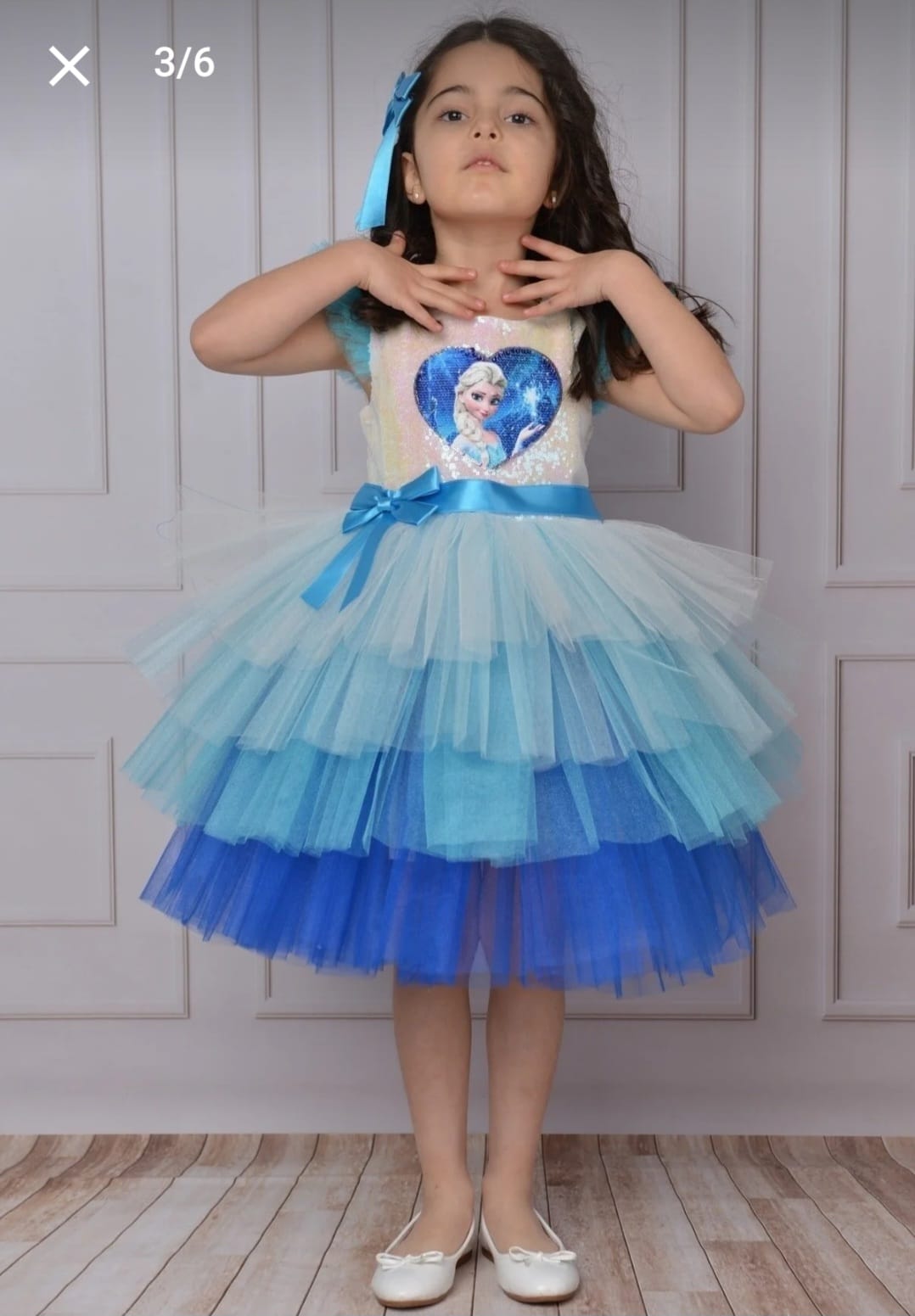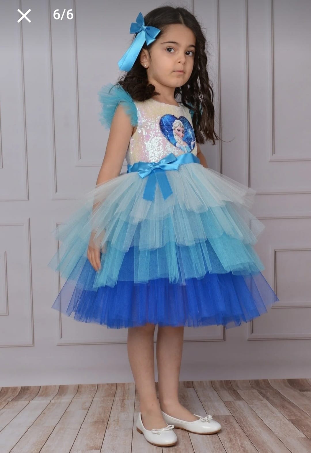 Straturi de Tulle Albastru: Partea de jos a rochitei este un adevărat spectacol de eleganță, cu straturi de tulle care creează senzația că micuța ta plutește pe un nor de gheață și adaugă un farmec de basm întregii ținute.